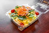 A mix of fresh crisp head iceberg and romaine lettuce, baby spinach, red onions, grape tomatoes, seedless cucumbers, green peppers & crispy shaved carrots.
